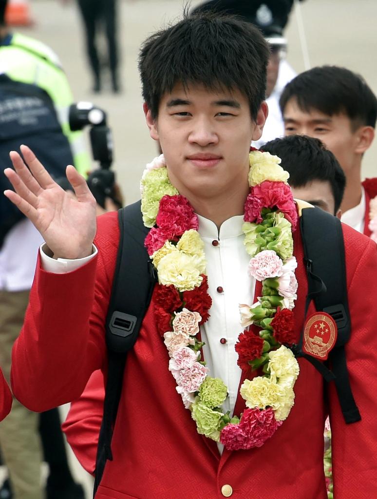 8月29日,游泳运动员潘展乐(前左)在欢迎仪式上。新华社记者 卢炳辉 摄