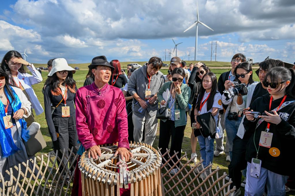 8月22日,参加第三十届海峡两岸大学生新闻营的师生们在内蒙古乌兰察布市辉腾锡勒草原体验搭建蒙古包。新华社记者 连振 摄