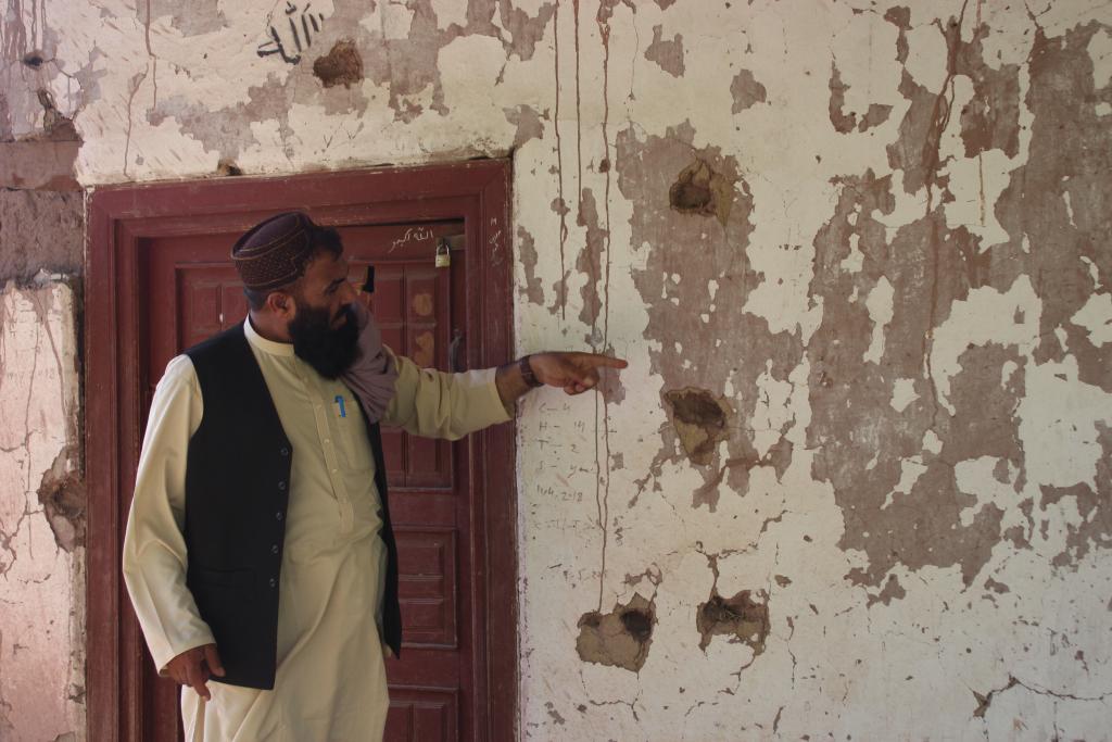 2023年7月30日,在美军战机曾经多次袭击的阿富汗楠格哈尔省赫萨拉克地区,一名村民指着美军当年袭击留下的痕迹向记者展示。新华社发(艾马尔·查希尔摄)