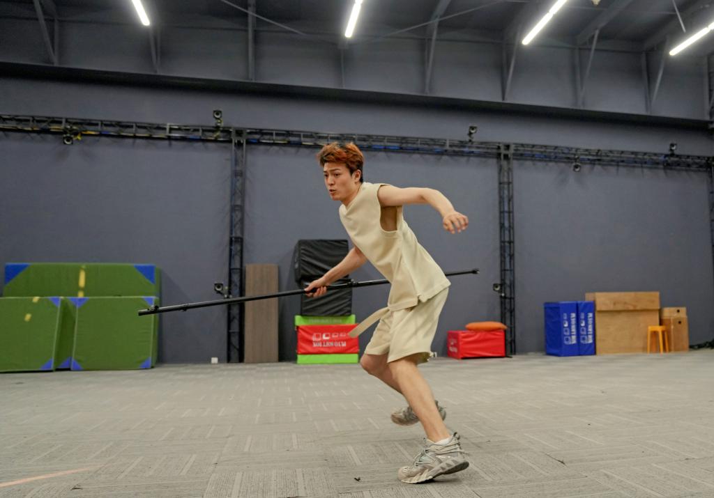 8月26日,在位于上海松江的动捕场地,殷凯在拍摄前练习动作。