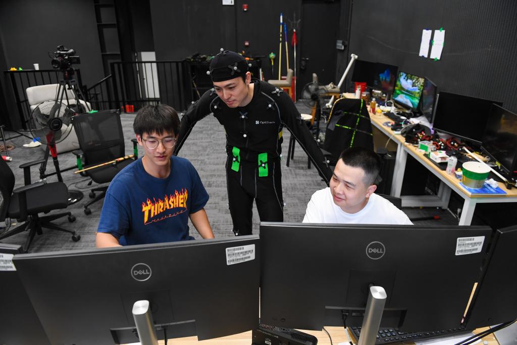 8月28日,动作捕捉师与殷凯(中)讨论动作设计。