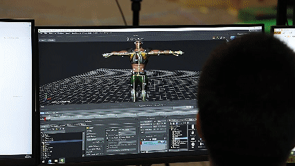 8月28日,动作捕捉师与殷凯(右)边看回放边讨论动作设计。
