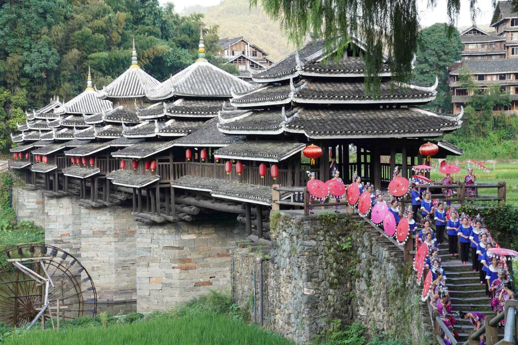 侗寨跨水而建。进入程阳八寨,首先要走过今年迎来100岁生日的程阳永济桥。此桥是楼阁式建筑,整座桥梁搭建时不用一钉一铆,主要由木料和石料建成,桥长近80米,宽近4米,高近12米,是我国建筑艺术中的珍品。