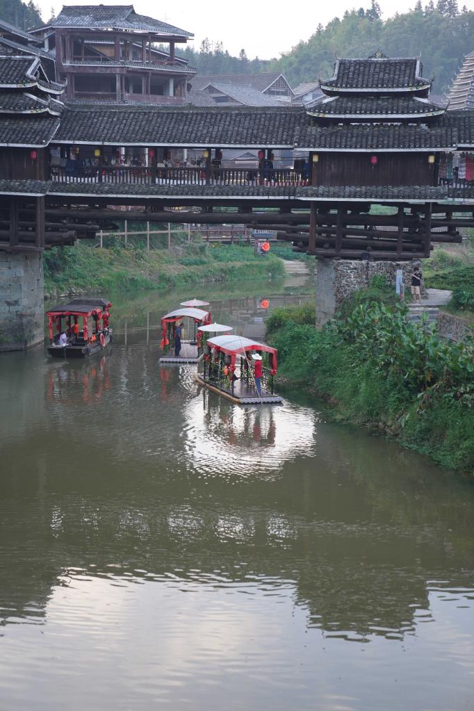 8月26日,在广西三江侗族自治县程阳八寨景区,游人乘船游览。新华社记者 尹栋逊 摄