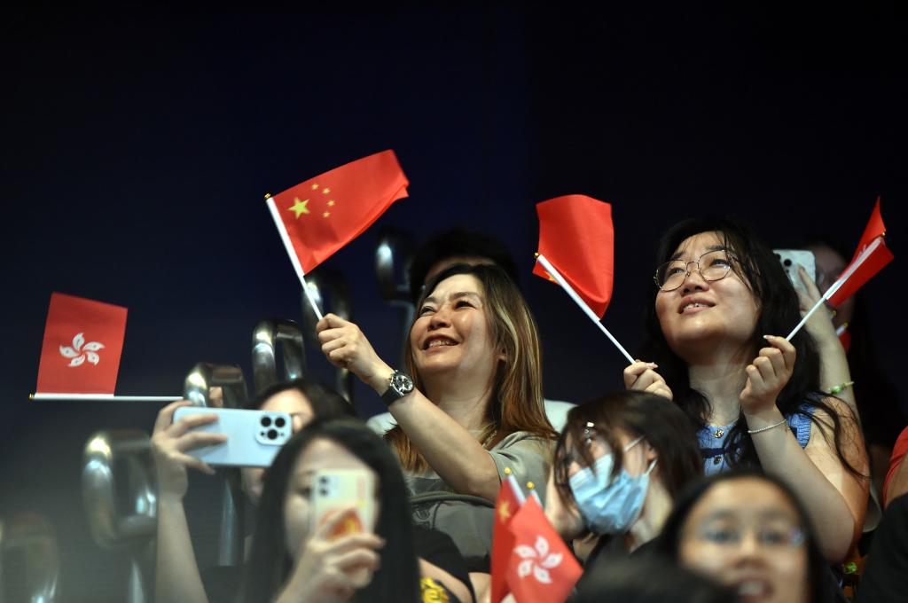 内地奥运健儿此行以朝气蓬勃的形象圈粉无数,展示出新时代的中国新形象。散场后,许多市民手持五星红旗和香港特区区旗合影留念。