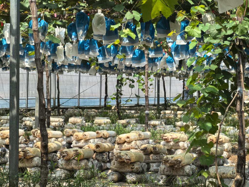 当地还倡导合理利用空间,坚持多元化发展。记者在兴安县严关镇马头山葡萄套种示范园看到,葡萄架下整齐地堆放着秀珍菇和木耳的菌棒,其中秀珍菇长势喜人。农户张玉香说,今年第一次尝试套种食用菌,富含有机肥料的菌棒使用后直接铺在地里可以增加土壤肥力。收获食用菌和葡萄后,冬季葡萄架下还可以种植草莓。“目前套种技术已经十分成熟,只要做好果园管护,循环套种模式收益比单种高很多。”