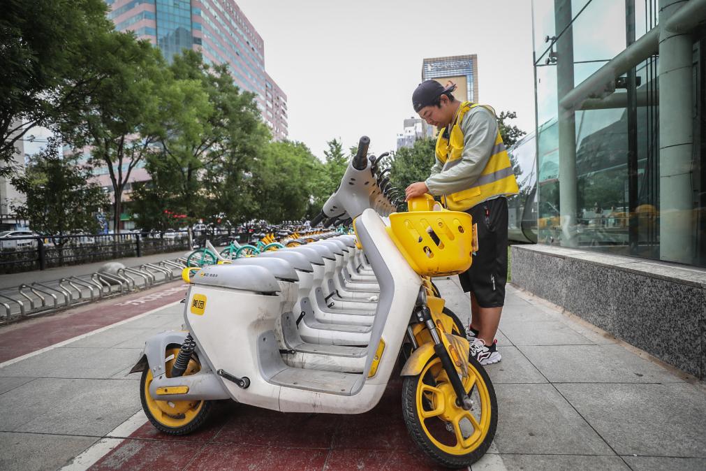 2023年7月11日,辽宁共享电单车运维员张春楠在检查共享电单车是否存在故障。新华社记者 潘昱龙 摄