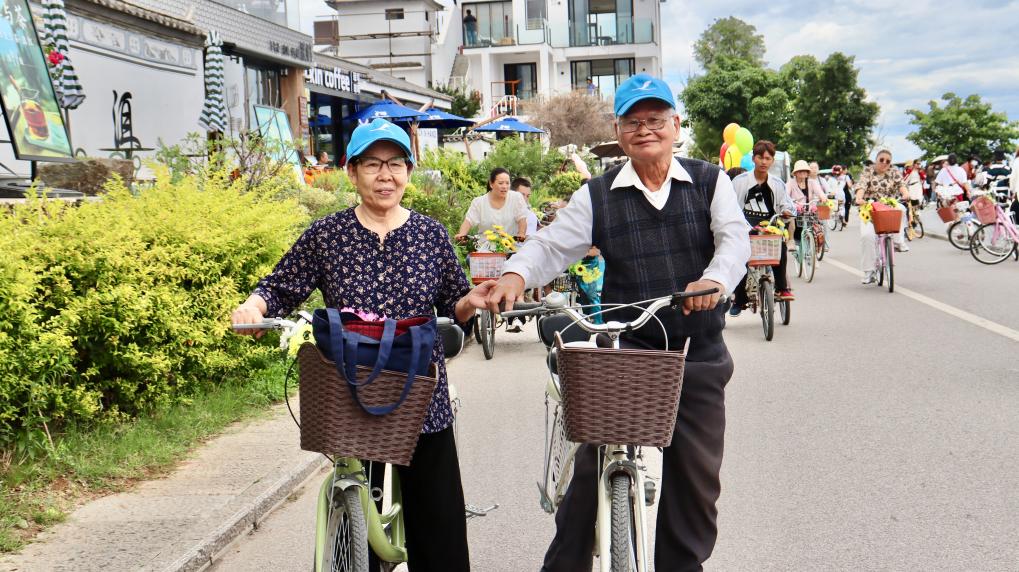 7月5日,一对已经退休的越南夫妻在大理洱海边骑行。 新华社记者 王贤思 摄