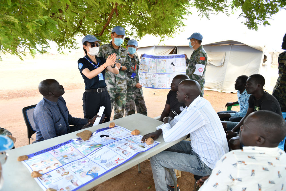 2020年3月,在南苏丹首都朱巴,执行联合国维和任务的中国维和警察廖洁给当地警察讲解防疫知识。