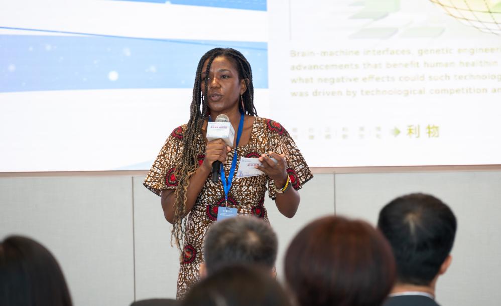 8月29日,在第二届清华国际青年对话论坛活动上,来自乌干达的媒体人詹尼弗·阿西姆韦分享中国之旅的感悟。新华社发(毕尚宏摄)