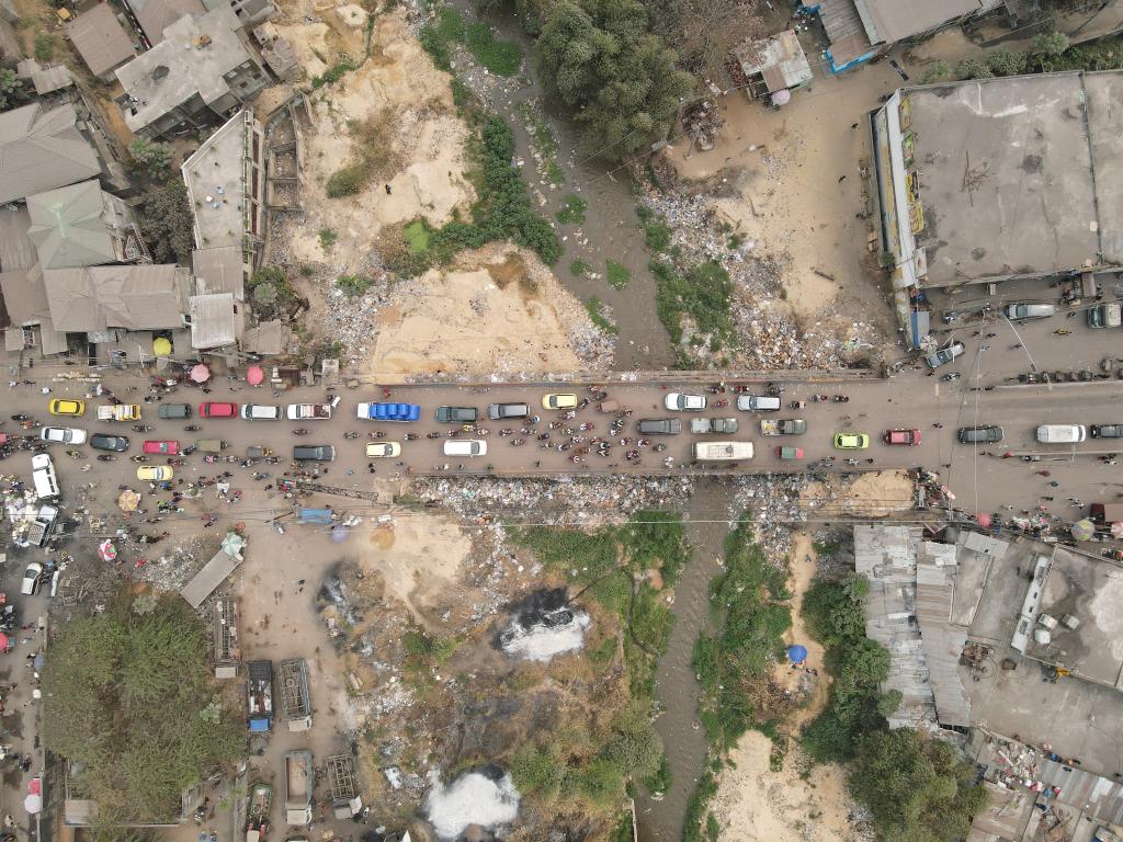 8月17日,在刚果(金)首都金沙萨郊区的金苏卡大桥上,通行车辆在桥上驶过。(无人机照片)
