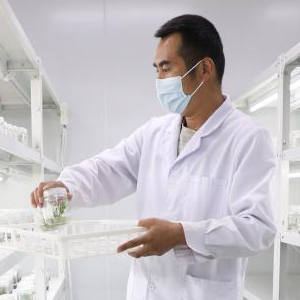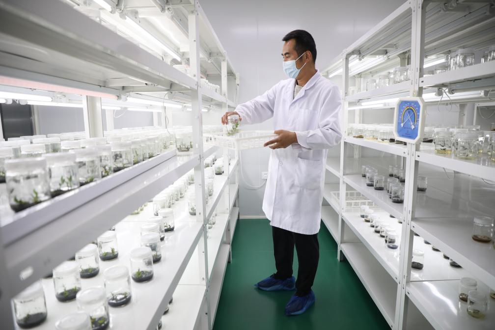 在陇西药圃园,工作人员在组培室摆放中药材种苗培养瓶(拍摄于2022年6月11日)。新华社记者 马希平 摄
