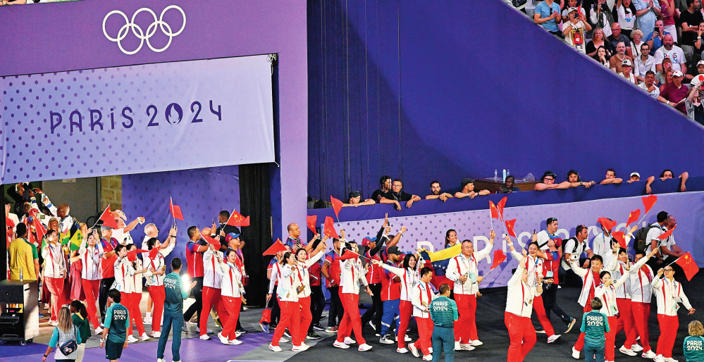 中国体育代表团在第33届夏季奥林匹克运动会闭幕式上入场(2024年8月11日摄)。王鹏摄/本刊