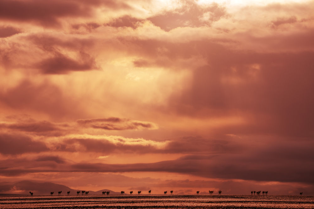 这一路上,它们翻越高山、蹚过冰河,面对各种自然挑战,只为新生命的诞生。当母藏羚羊在产仔地顺利产下幼崽,那稚嫩而顽强的生命便在这片神秘而壮美的土地上开始了它的旅程。小羊羔在母亲的呵护下茁壮成长,学习着如何在这片严酷的环境中生存。而母羊则用自己的身体力行,教会它们迁徙的智慧和勇气。它们的蹄声在草原上回荡,伴随着远处雪山的回响,是对生命不息的最好诠释。藏羚羊的每一步,都与这片土地的呼吸同频共振,仿佛在与大自然共同演绎着生命的轮回之舞,共同编织着青藏高原的生命乐章。