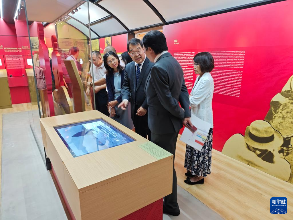 9月3日,香港历史博物馆总馆长张锐森(中)介绍香港抗战及海防博物馆展览内容。新华社记者 褚萌萌 摄