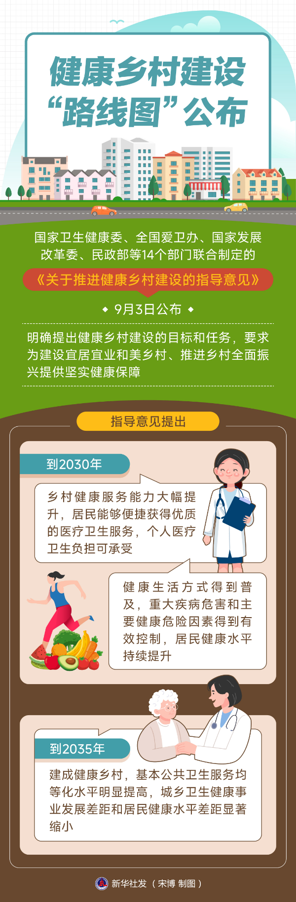 指导意见提出,到2030年,乡村健康服务能力大幅提升,居民能够便捷获得优质的医疗卫生服务,个人医疗卫生负担可承受;健康生活方式得到普及,重大疾病危害和主要健康危险因素得到有效控制,居民健康水平持续提升。到2035年,建成健康乡村,基本公共卫生服务均等化水平明显提高,城乡卫生健康事业发展差距和居民健康水平差距显著缩小。