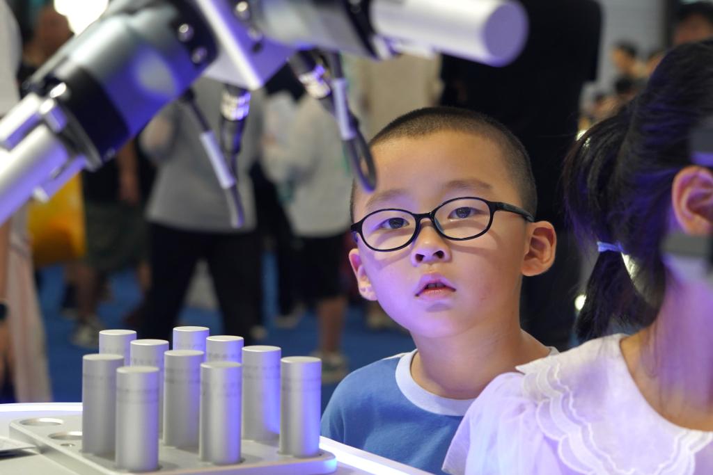 9月1日,在世界动力电池产业链供应链成果展示活动现场,小朋友在观看机械臂演示。新华社记者 唐文豪 摄