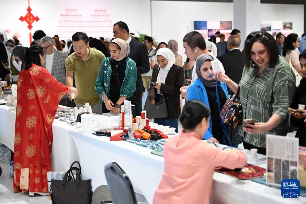 9月3日,人们在科威特艾哈迈迪省举行的“天涯共此时·湘约中东”文艺演出活动前参观中国茶艺文化展台。新华社发(阿萨德摄)