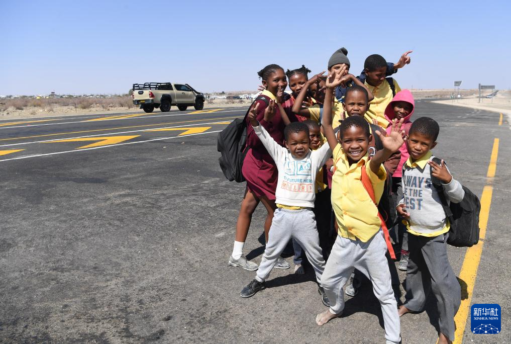 9月3日,在纳米比亚南部城镇策斯,孩子们在修复后的B1高速公路路段上合影。新华社记者 陈诚 摄