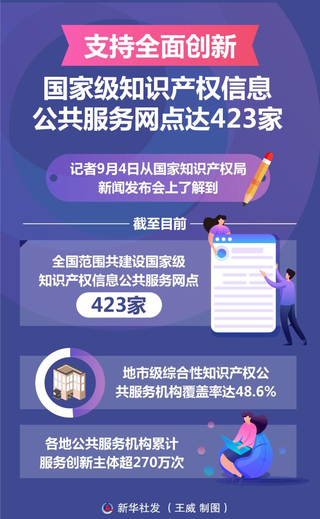 新华社北京9月4日电(记者宋晨)记者4日从国家知识产权局新闻发布会上了解到,截至目前,全国范围共建设国家级知识产权信息公共服务网点423家,地市级综合性知识产权公共服务机构覆盖率达48.6%,各地公共服务机构累计服务创新主体超270万次。