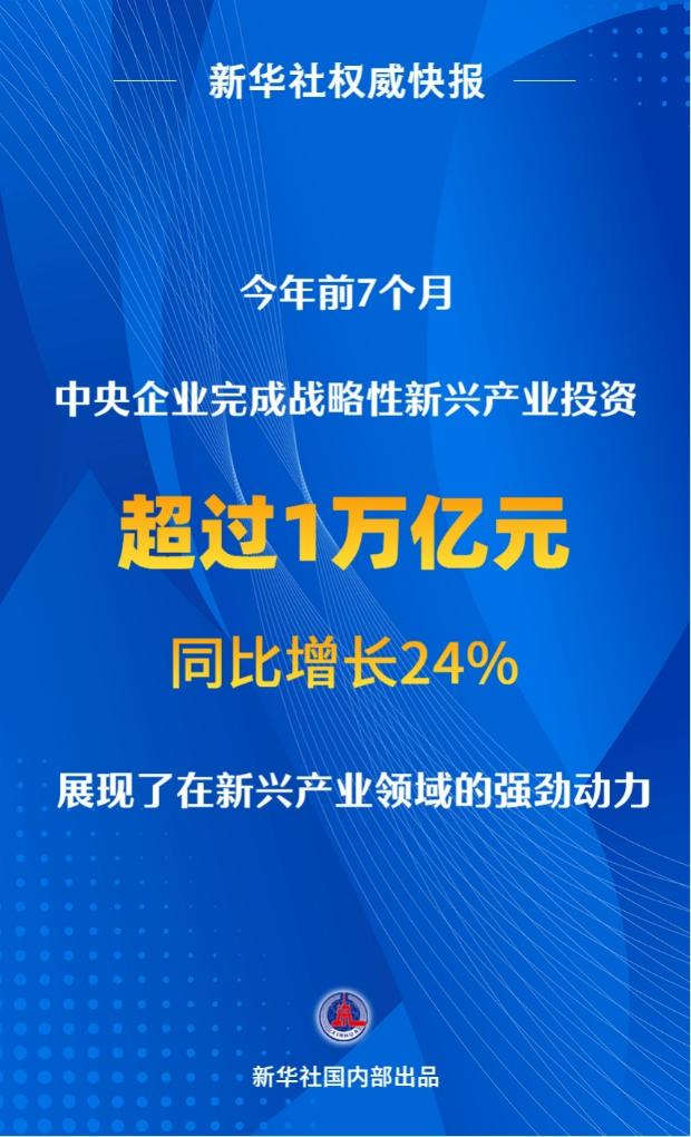 记者9月5日从国务院国资委了解到,今年前7个月,中央企业在战略性新兴产业的投资力度持续加大,完成投资超过1万亿元,同比增长达到24%,占到央企总投资的38%,展现了中央企业在新兴产业领域的强劲动力。