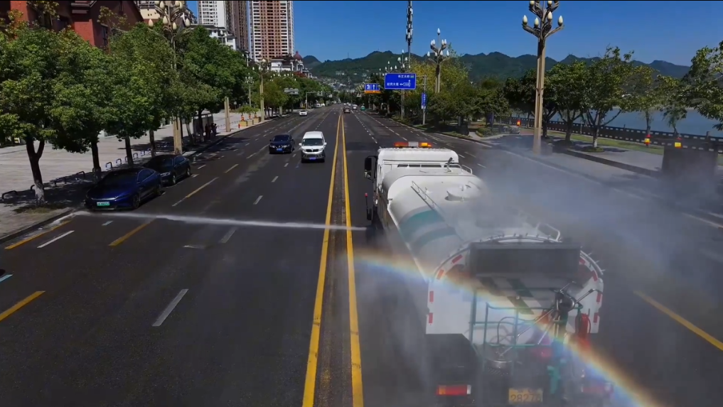 重庆涪陵区城市管理局每天出动37辆环卫洒水车、吸尘车、多功能清扫保洁车进行清洁,投入6台环卫洒水车每天分三个时段对城市主干道洒水喷雾降温降尘,为市民送上清凉。