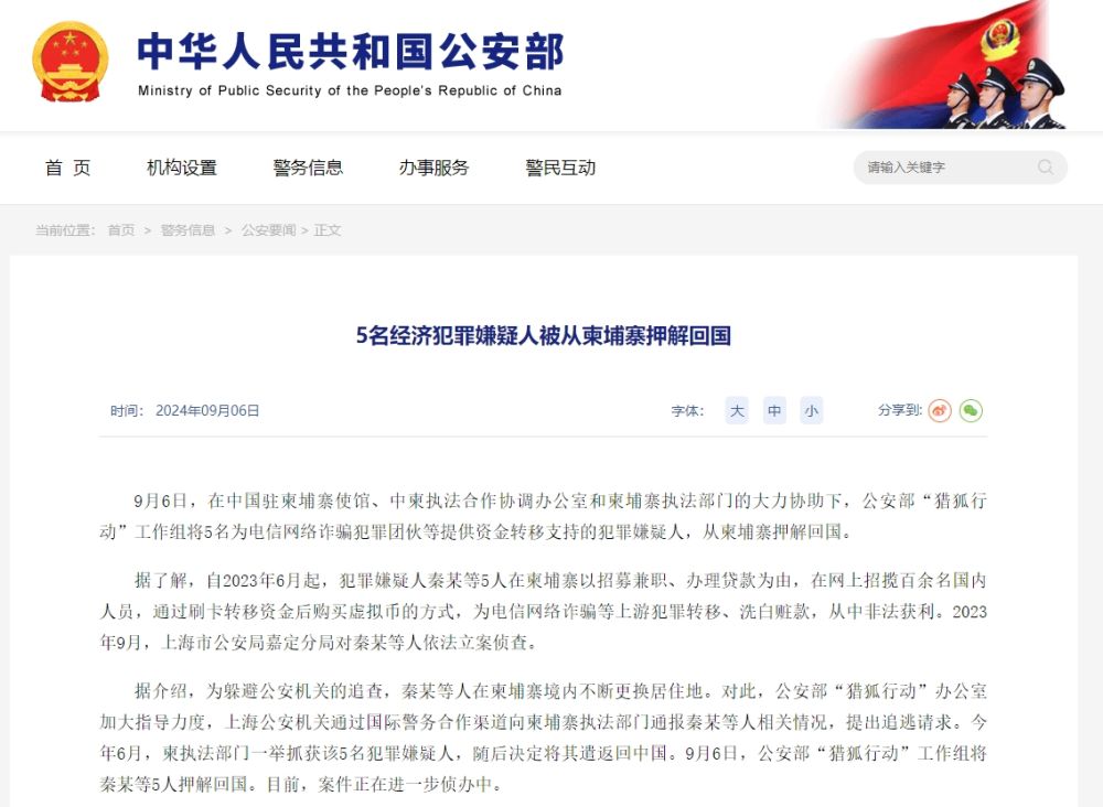9月6日,在中国驻柬埔寨使馆、中柬执法合作协调办公室和柬埔寨执法部门的大力协助下,公安部“猎狐行动”工作组将5名为电信网络诈骗犯罪团伙等提供资金转移支持的犯罪嫌疑人,从柬埔寨押解回国。