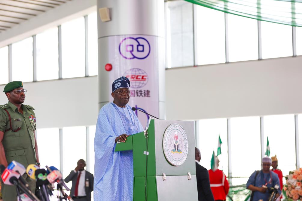 5月29日,尼日利亚总统提努布在由中企承建的阿布贾城铁商业运营启动仪式上讲话。新华社发(闫玉娟摄)