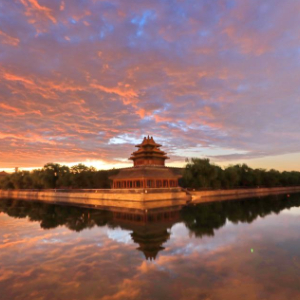 2024年9月6日,北京,朝霞映照故宫角楼,天空被晕染成橙色,云彩、护城河、角楼相映成趣,美不胜收。