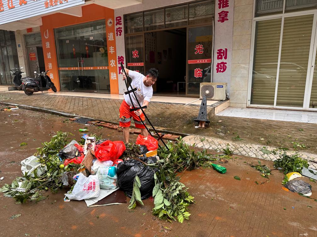 商家在清理门前的垃圾和杂物。 新华社记者 胡拿云 摄