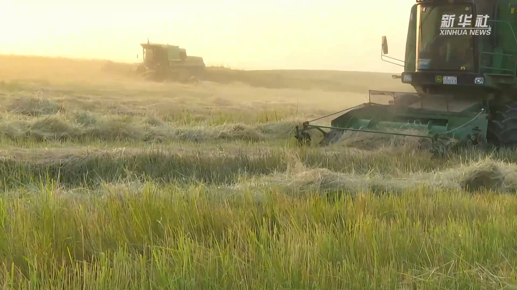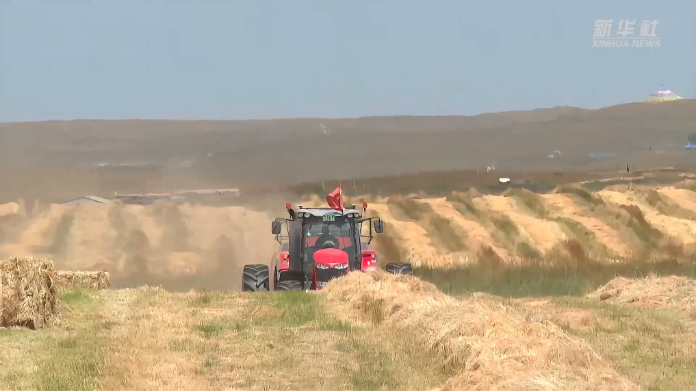 近日,青海省海南藏族自治州贵南县,迎来了牧草丰收的季节,人工饲草地上连片的金黄色牧草一望无垠,收割机穿梭在田野中,一派热闹的秋日丰收景象。