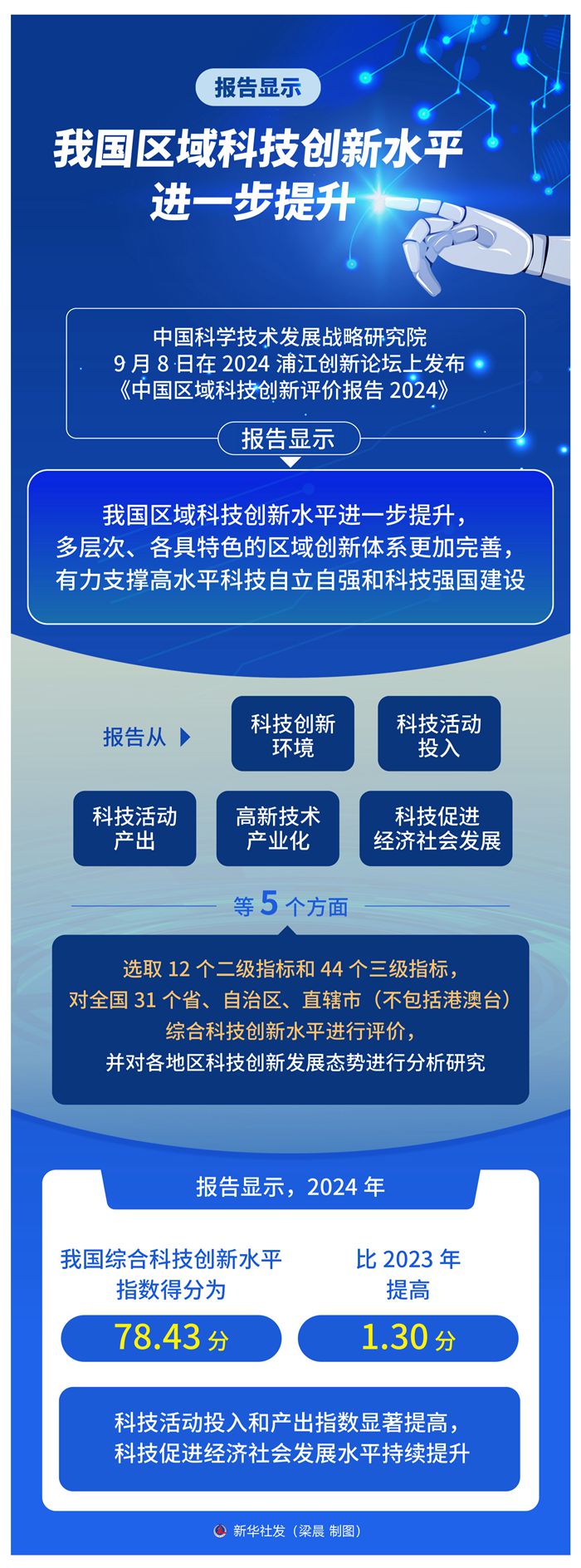 报告显示,2024年,我国综合科技创新水平指数得分为78.43分,比2023年提高1.30分,科技活动投入和产出指数显著提高,科技促进经济社会发展水平持续提升。