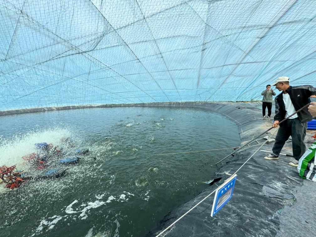 养殖基地的职工正在进行捕捞。新华社记者沈晓朦 摄