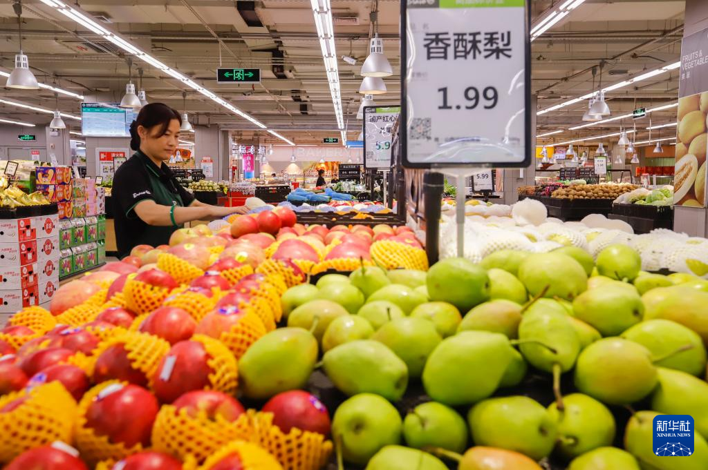 9月9日,工作人员在河北省遵化市一家超市整理水果。 新华社发(刘满仓摄)