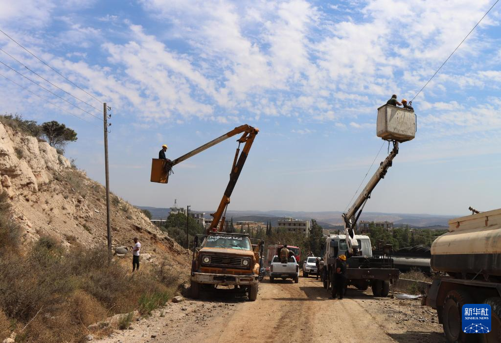 9月9日,在叙利亚中部哈马省迈斯亚夫地区,人们修复空袭中受损的基础设施。新华社发