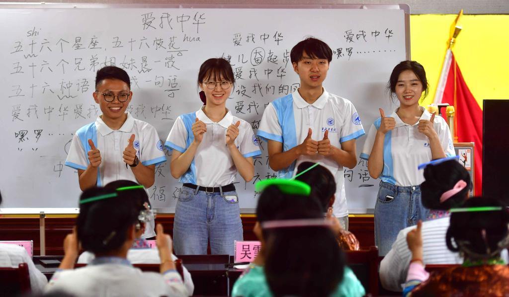 西北工业大学的研究生支教团在课堂上和妇女们互动(2020年7月28日摄)。