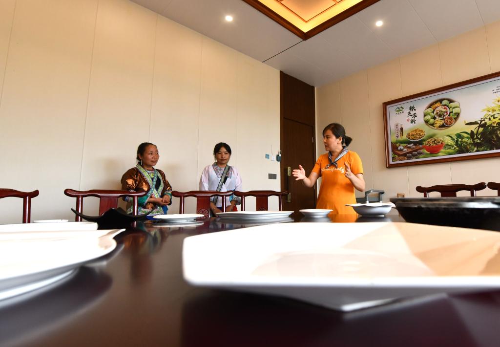 在融水苗族自治县的一家农庄,负责人梁壬梅(右一)在指导乌英妇女如何做好餐饮接待工作(2022年7月29日摄)。