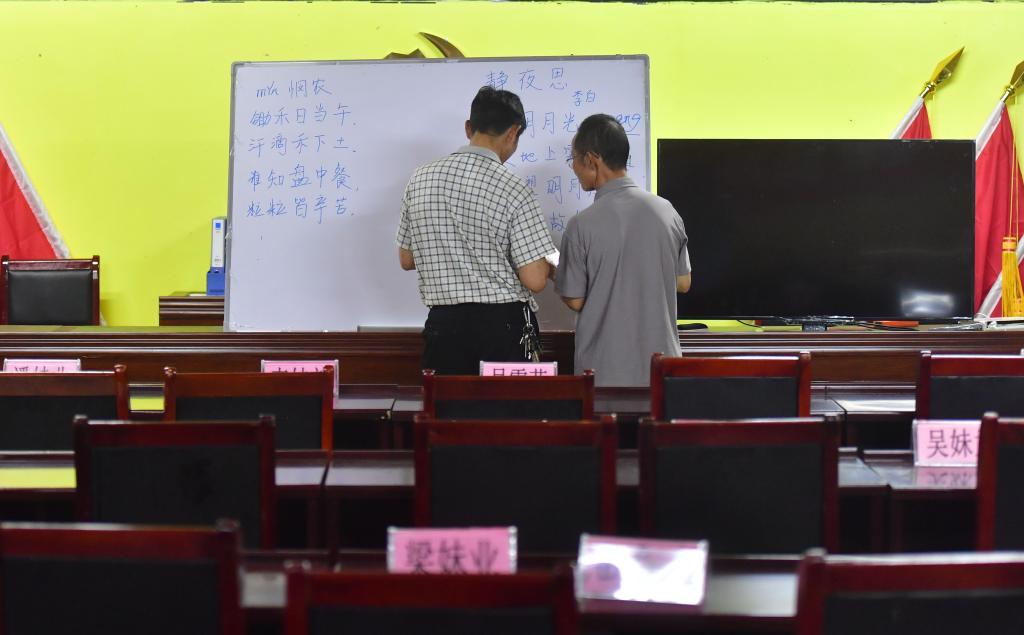 乌英苗寨74岁的梁安合(右)和村干部在课后备课(2020年6月18日摄)。