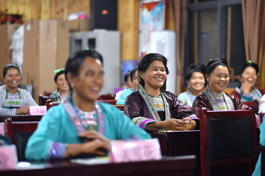 乌英苗寨“双语双向”夜校的妇女们在听课(2020年9月11日摄)。
