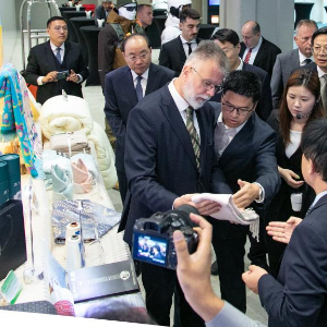 9月10日,在塞尔维亚首都贝尔格莱德,塞尔维亚信息和电信部长里斯蒂奇在中国(山东)-塞尔维亚经贸合作交流会上了解来自中国山东省企业的产品。新华社发(王韡摄)