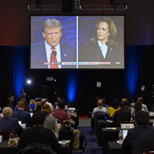 当地时间10日晚,美国民主党总统候选人、副总统哈里斯和共和党总统候选人特朗普在费城展开首场电视辩论。近期民调结果显示,两人支持率接近。