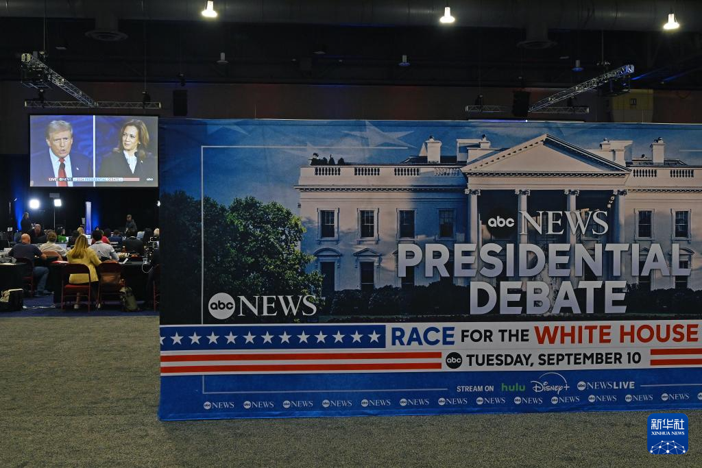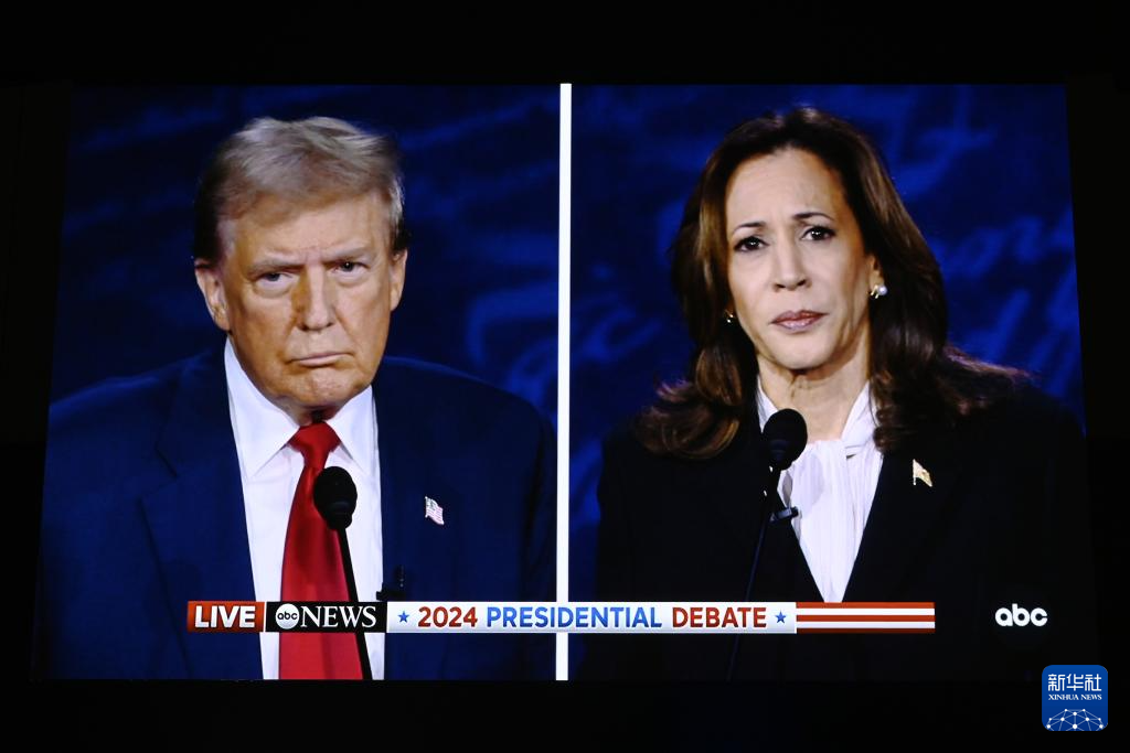 这张9月10日在美国费城总统辩论媒体中心拍摄的视频直播画面显示,美国民主党总统候选人、副总统哈里斯(右)与共和党总统候选人、前总统特朗普在费城参加电视辩论。新华社记者 李睿 摄