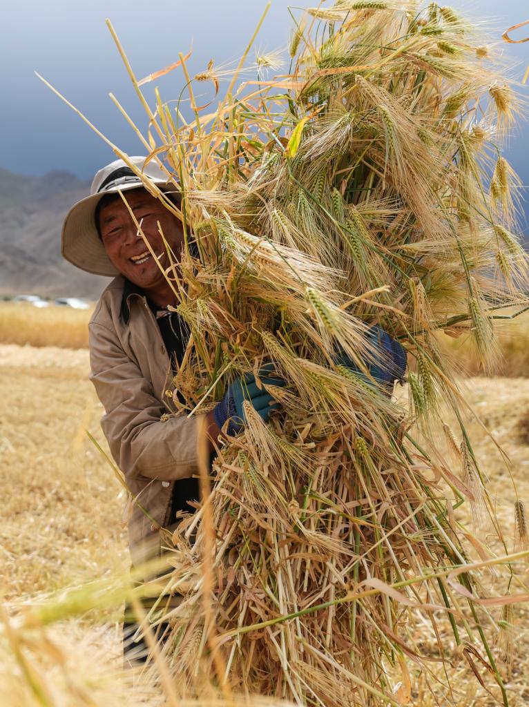 9月10日,西藏日喀则市白朗县巴扎乡农民在收获青稞。新华社记者 晋美多吉 摄