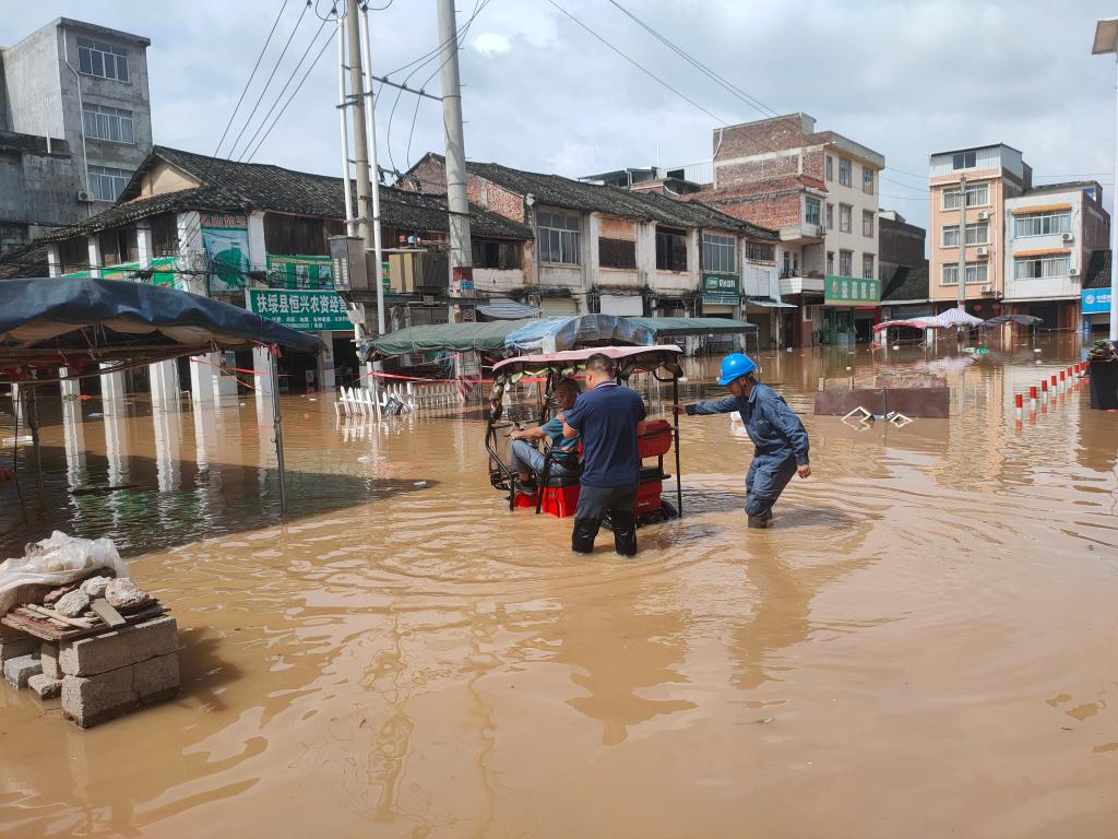 9月11日,南方电网广西崇左扶绥供电局龙头供电所员工在乡镇街道对供电变压器围好警戒线后,协助村民离开涉水区。新华社发(黄军淋摄)