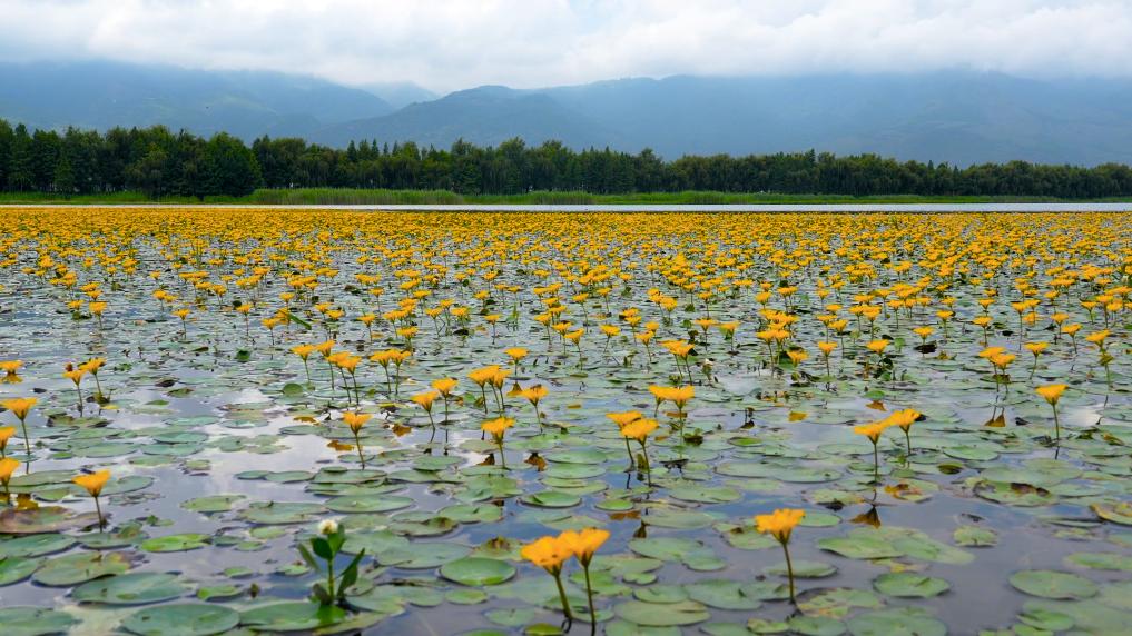 金秋九月,云南省大理白族自治州洱源县茈碧湖迎来了一片生机勃勃的景象。湖面上荇菜花盛开,金黄色的花朵与蓝天、碧水、芦苇相映成趣,水鸟翩飞,共同绘制出一幅动人的生态画卷。
