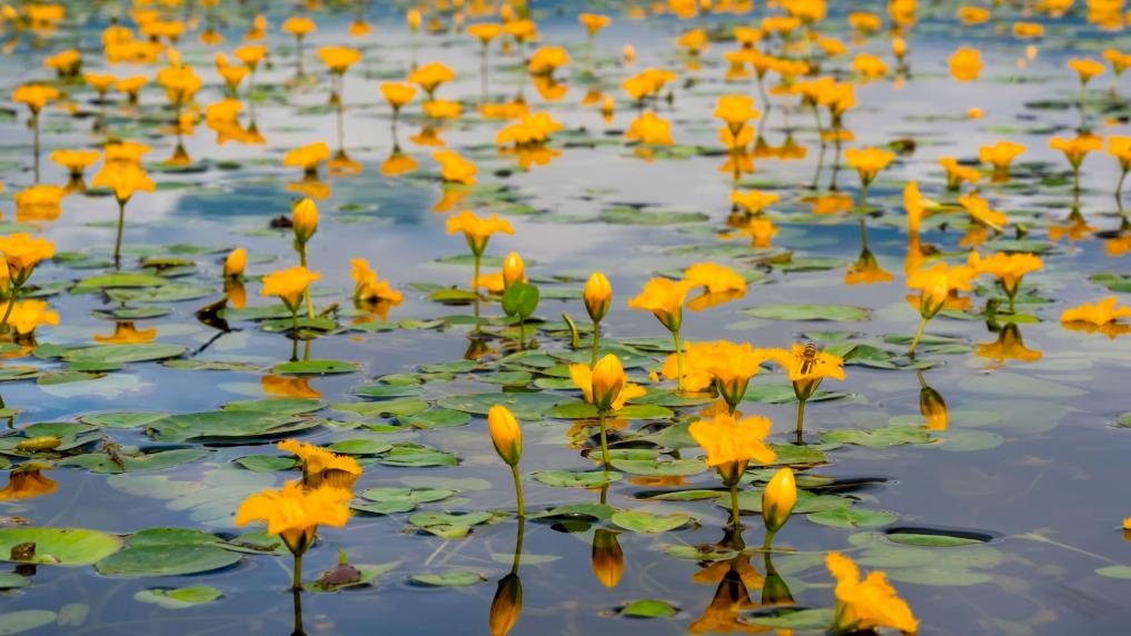 荇菜花是一种湿地的浅水性植物,它的生长有很好的观赏性,同时也能抑制藻类生长,在生长过程中,能净化湖体水质。