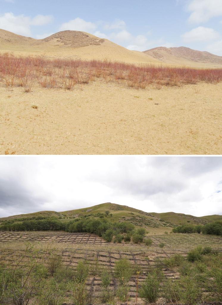 拼版照片:上图为若尔盖县辖曼镇西仓村沙化土地治理前的场景。新华社发(资料照片);下图为该处采用“高山柳沙障+植灌+种草+施肥+围栏+管护”的措施进行综合治理后的场景(9月6日摄)。新华社记者 胥冰洁 摄