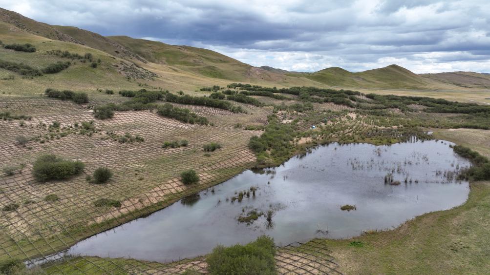9月6日拍摄的若尔盖县辖曼镇西仓村治沙点,一处洼地已变成了小水塘。新华社记者 胥冰洁 摄