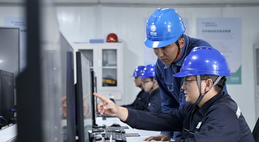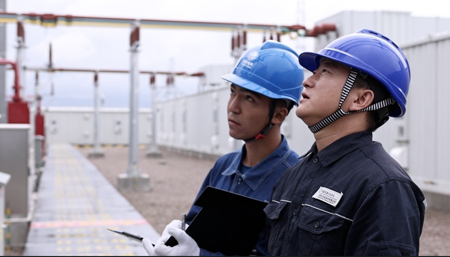 李旭龙(右一)和同事进行日常设备巡检。新华社发