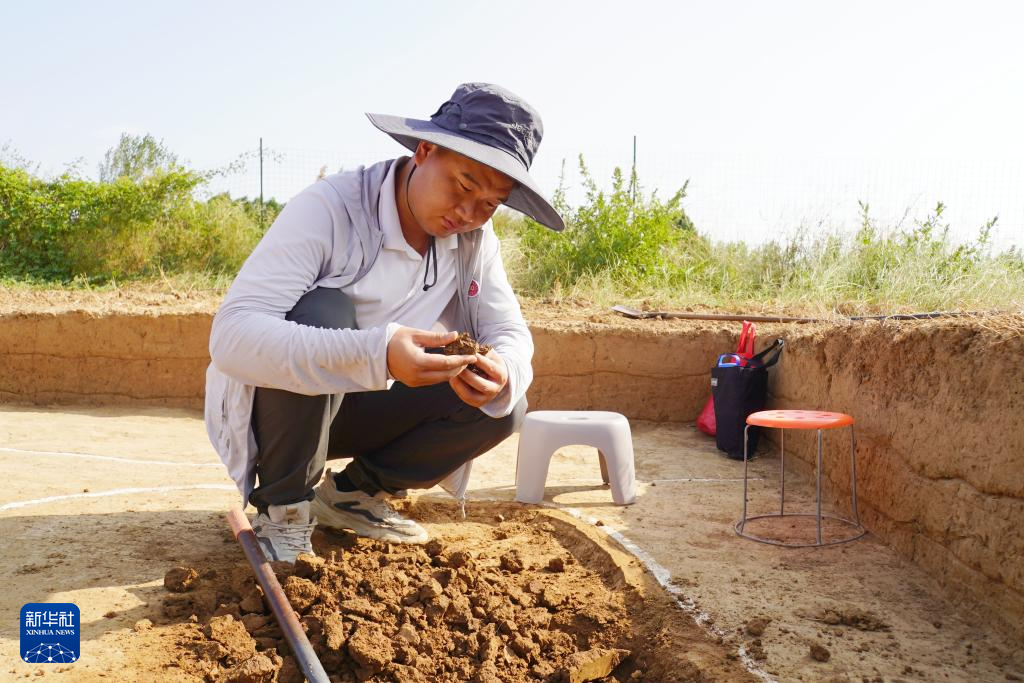 9月11日,考古人员在八里桥遗址观察土样。新华社记者 袁月明 摄